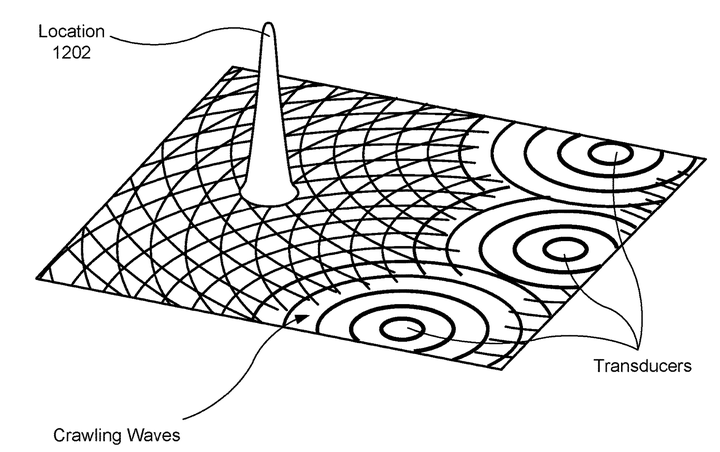 A method of creating localized haptic stimulations on a user includes a wearable device including a plurality of transducers that can each generate one or more waves that propagate away from the wearable device through a medium. The method includes activating two or more transducers of the plurality of transducers, selecting values for characteristics of waves to be generated by the two or more transducers based at least in part on a known impedance of the medium. The method further includes generating, by the two or more transducers, waves that constructively interfere at a target location to create a haptic stimulation on a user of the wearable device, the waves having the selected values.